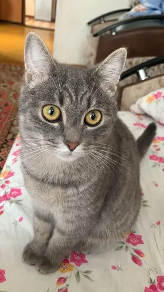 окрас серый со светлыми полосками на хвосте и лапах, глаза зеленые. Мяукает, ходит вокруг и ищет хозяев. Кошка ласковая, явно домашняя, идет на контакт, ухоженная.