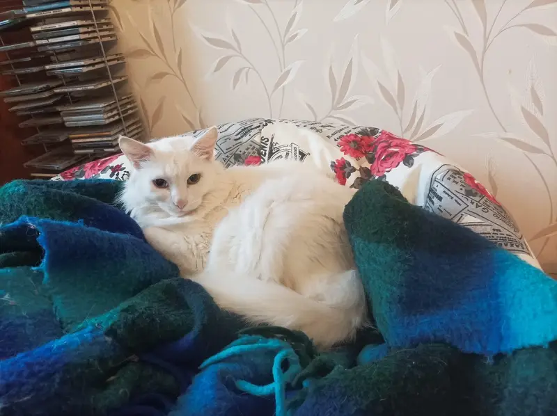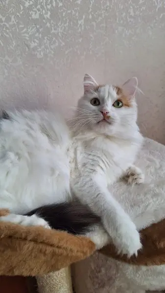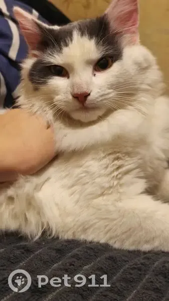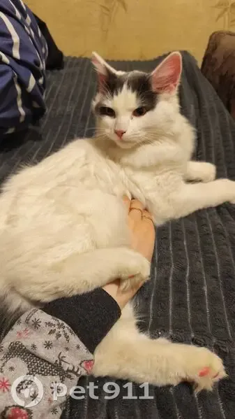 Вчера сняли этого красавца с высокого дерева. Котик очень ласковый, чистый и ухоженный — явно домашний, потерялся или выбросили. Совсем не боится людей,мурлыкает, идет на руки. Окрас белый, серый хвост и лоб, ушки розовые, есть серое пятно на левой ноге и пятно виде сердца на левой передней лапке.