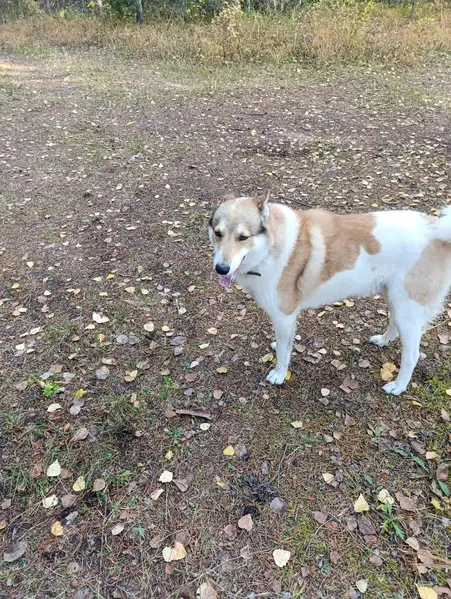 Две собаки бросились ко мне под ноги, в ошейниках, на лайке оборванный поводок - стропа. Подольск, Шепчинки, уд.Народная, д.24