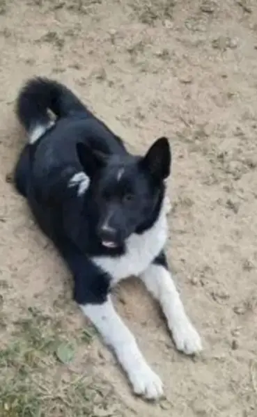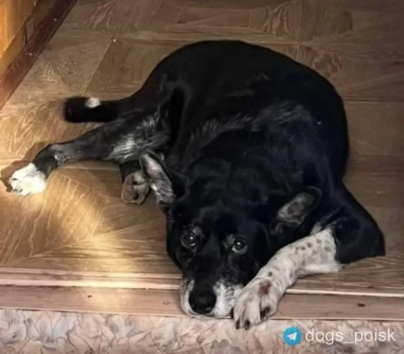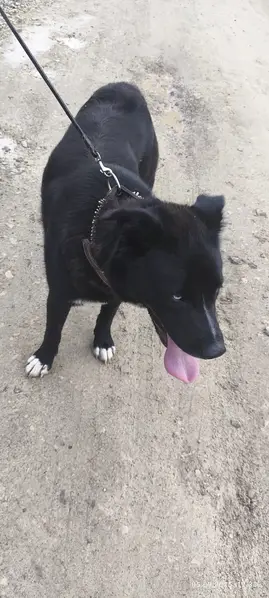 Кобель,молодой ,спококойный ,черный с одной передней белой лапкой в черную крапинку.прибился и никуда не уходит