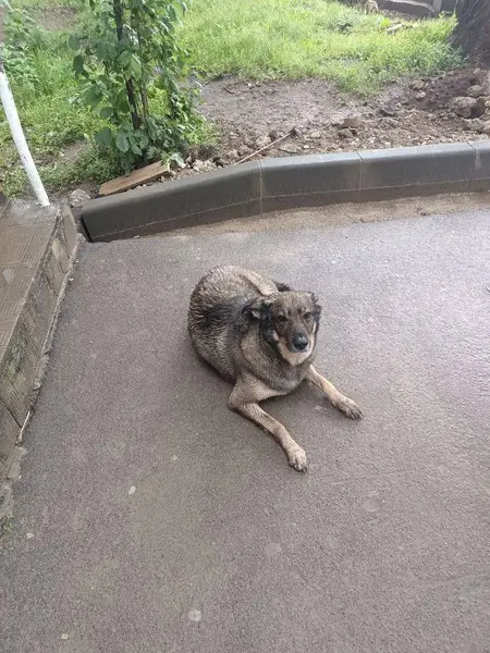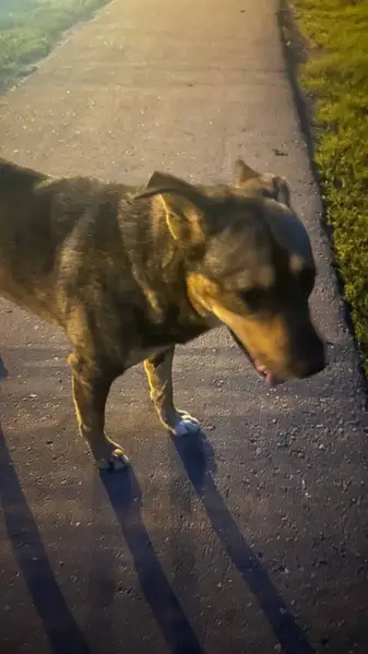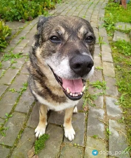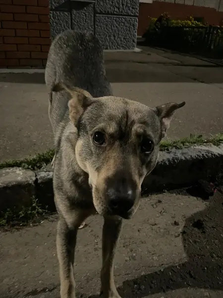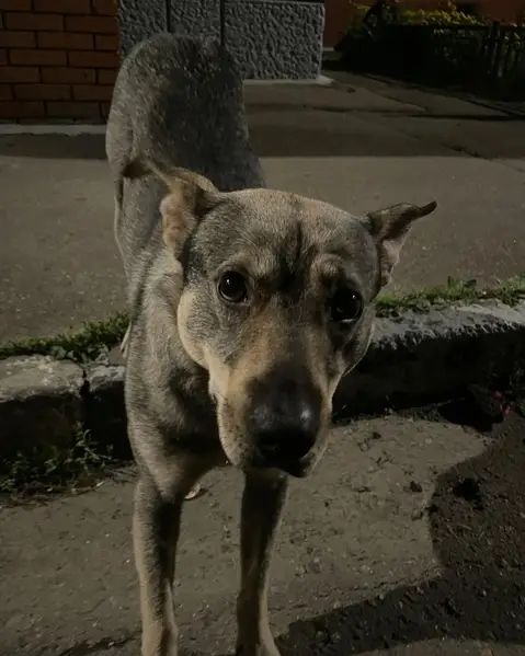 Зонарного окраса, похожа на волчонка. Спокойная, ласковая. На собаке был ошейник темного цвета с вышивкой. Собака ниже колена.