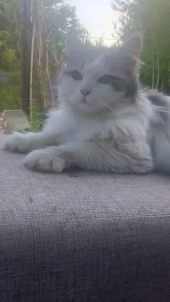 Белого цвета, с небольшим черным пятнышком на голове. Глаза голубые, на шее зеленый ошейник (возможно, ошейник мог потеряться).