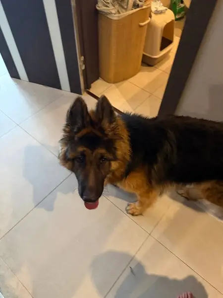 Немецкая овчарка, длинношерстная, черно рыжая, есть клеймо.