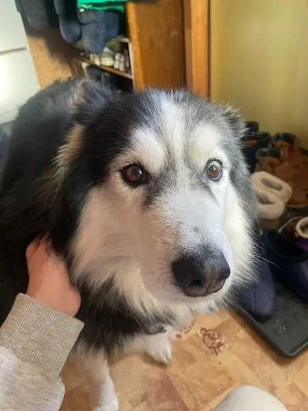 Окрас серо-белый, кобель. Были на прогулке, пёс увидев кошку вырвался из ошейника. Приблизительно в 7:20, видели его перебегающим дорогу ул. 43-й Армии в сторону ул. Ленинградская, д. 21.