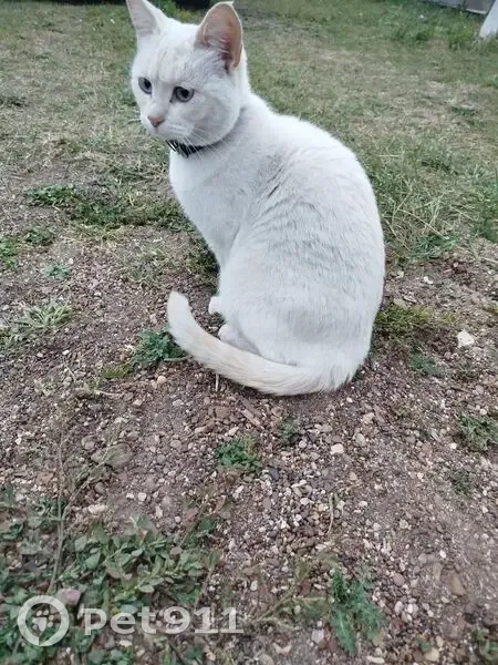 Белая, на хвосте бледно рыжие полоски, глаза голубые, очень ласковая, сначала была без ошейника, после появился ошейник с надписью BOSS и с короной из стразиков.