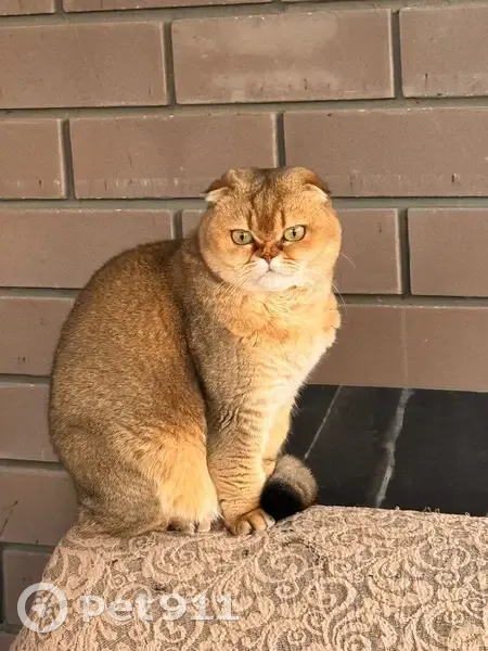 Вислоухая шотландская кошка, ночью вышла погулять, по камерам увидели что во двор вбежали стая собак, кошка, скрылась на соседнем дворе.Персикового окраса.