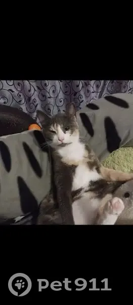 Дымчатая, цвет мокрого асфальта. Есть рыжие пятна, одна передняя лапка рыжая. Носик и грудка белые, на подбородке тёмное пятно. Возраст 2 года, диковатая. Домашняя кошка, спрыгнула с балкона и пропала