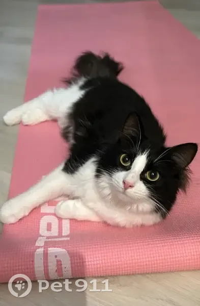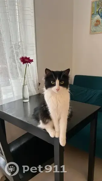 Черно-белый окрас, желтые глаза, очень пушистый хвост, пугливый, кастрирован, не агрессивный. Непривычное для него место, сорвался со шлейки. Котику год
