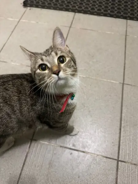 Кошка, 3 года, стерилизованная. Кличка Мура. Окрас серый, полосатый хвост с черным кончиком, лапки внизу белые, как носочки. Задняя правая лапка с длинным белым носочком. Белая грудка, пятнышко на носике белого цвета. Длинные белые усы и вздутая область рта.