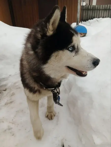 Смесь хаски и маламута. Бело-серый окрас. Глаза разного цвета: один голубой, другой карий.