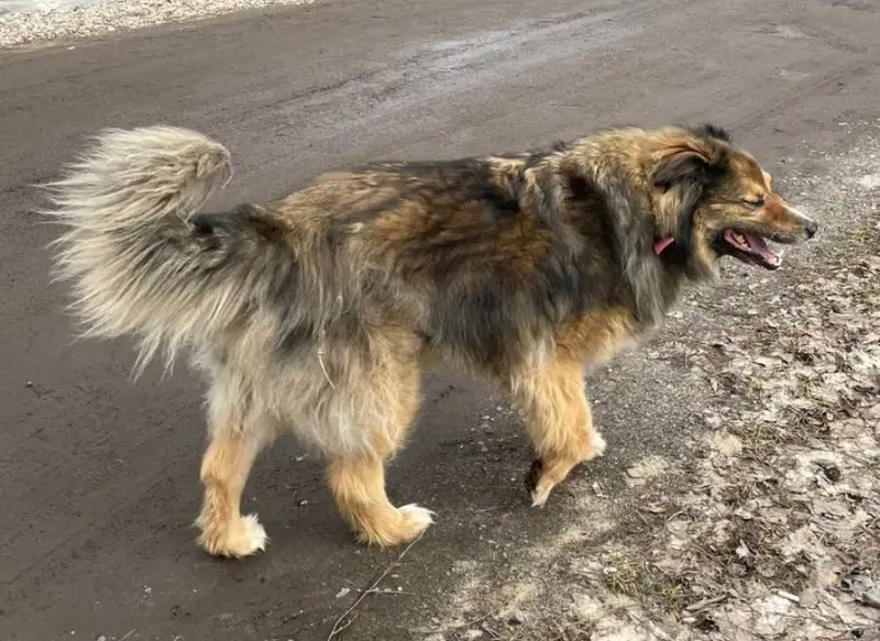 Убежала на прогулке. Коричневый окрас с черной окантовкой. Короткие лапы, длинное туловище, пушистый хвост