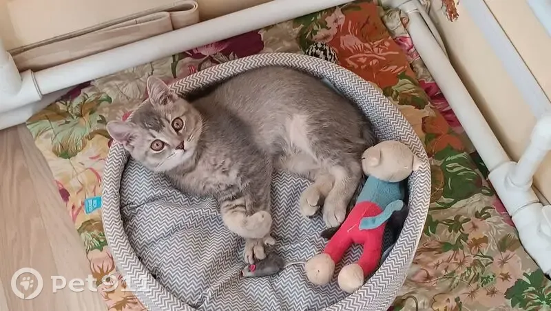 Серый котенок с черными подушечками лап, темный конец хвостика, чёрно-белые усики, не очень хорошо отзывается на свое имя, игривый