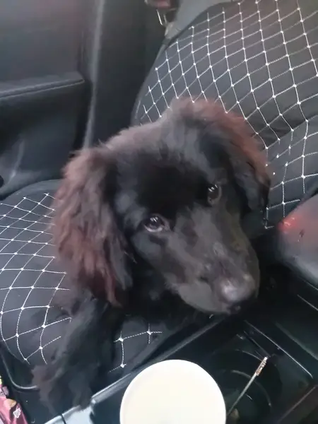 Окрас-чёрный. Ошейник красный. Пёс молодой, дружелюбный, веселый. Бегал на улице за людьми, выбегал на дорогу.