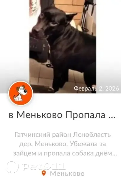 Чёрная гладкошерстная сука в серой жилетке с оранжевым воротничком с ошейником. 8 лет не агрессивная, ласковая. Кличка - Вальтер. В Меньково днём 2 февраля 2026 г. Собака убежала за зайцем и пропала. Могла вернуться в район проживания. Любая информация в любое время ждём по тел. 89219131070. Ищем.