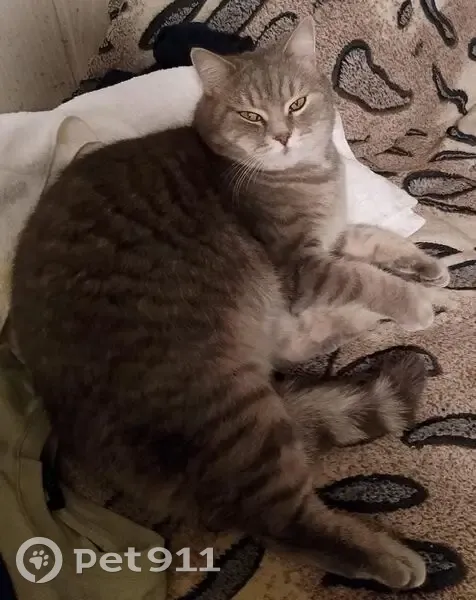 Окрас серый, хвост в полоску, крупный, ошейника нет. Пугливый, боится шума и может прятаться в укромных уголках, сам не пойдет к чужим. Вышел гулять 05.12. Около 18 ч. Мы недавно переехали из другого города на эту улицу, кот местность не знает.