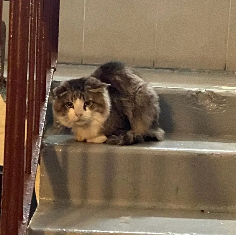 Кошечка робкая, из особенностей: хвост колечком.