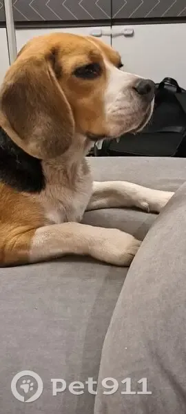Бигль, пузо и лапы белые, темная шерсть на спине. Очень умный и послушный