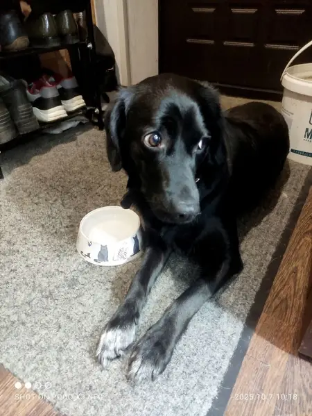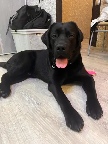 У него чёрный окрас парода лабрадор, кличка эзель ещё откликается когда его завешь сына, храмает на пиредние лапки, у него ошейник был чёрный с бабочкай весь в стразах