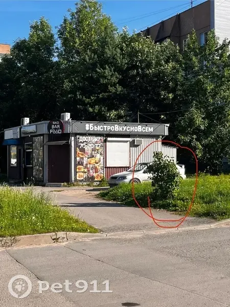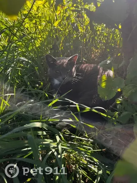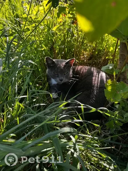 Окрас похож как у британца, серо-голубой, один глазик когда то был повреждён наверно, со стороны так кажется.Второй нормальный. Лежал под кустиком в тени, была с собакой потому не подошла слишком близко.