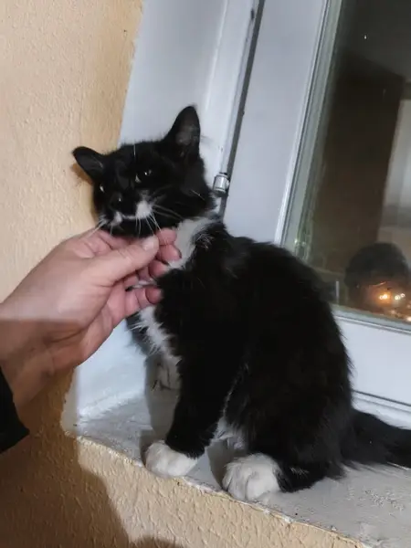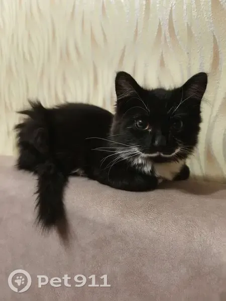Котёнок чёрный, на лапках белые носочки, есть белая грудка и усики. Котёнок был найден в подъезде. По камерам внутри дома удалось установить, что котёнок попал в подъезд 05.01.2026 примерно в 22:26. Поведение указывает, что котёнок был раньше дома. Ласковый, ручной, игривый, умный, ухоженный