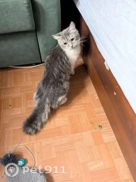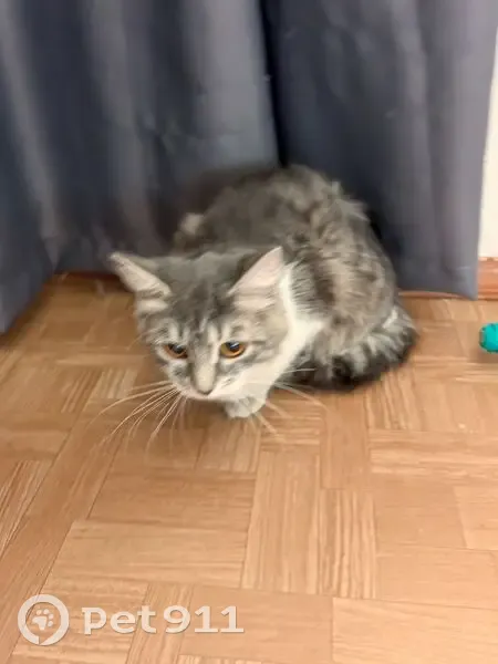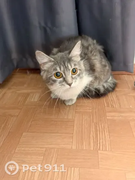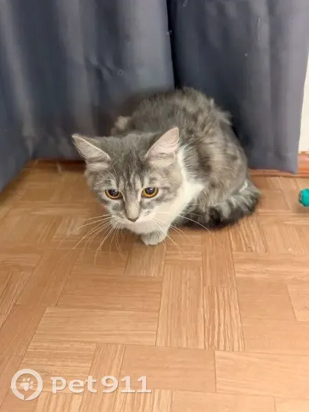 Молодая кошечка, предположительно выпала из окна или случайно выбежала. В стрессе, но не нападает, сидит на руках нормально. Из особенностей: ярко оранжевого цвета глаза и непропорционально короткий хвост. Есть пара ссадин, в остальном цела и здорова.