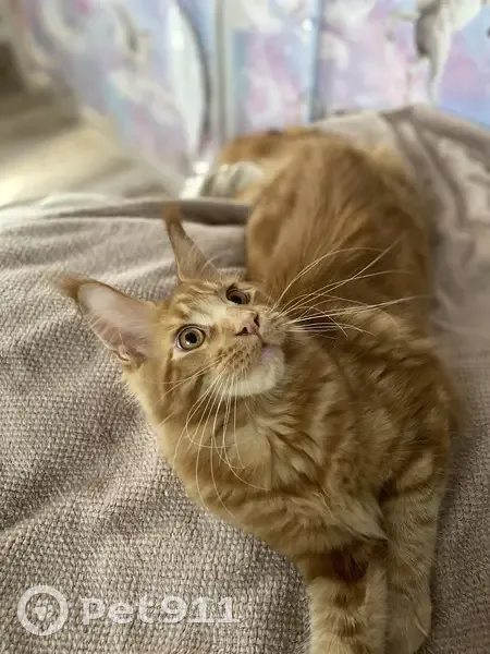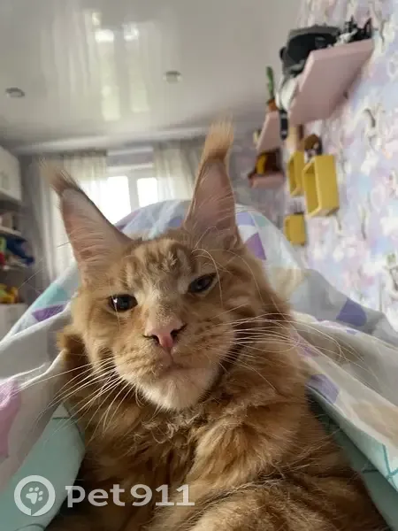 Рыжий, оранжевый ошейник на шее, оранжевые глаза, не сильно крупный для мейкуна, ему 11 месяцев , может быть с шансом 86% идти в полу присяде Нашедшему позвонить на телефон +7 (953) 253-77-53 или +7 (900) 997-55-22 Гарантировано вознаграждение нашедшему
