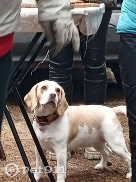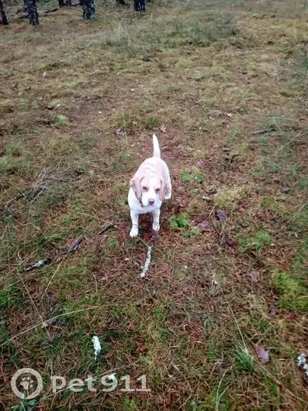 Белая с рыжими пятнами, бигль , клеймо на животике, плотная , короткие лапки, хвостик как антенка , не агрессивная совершенно , очень дружелюбная , по спинке рыжая и белая как змейка расцветка .
