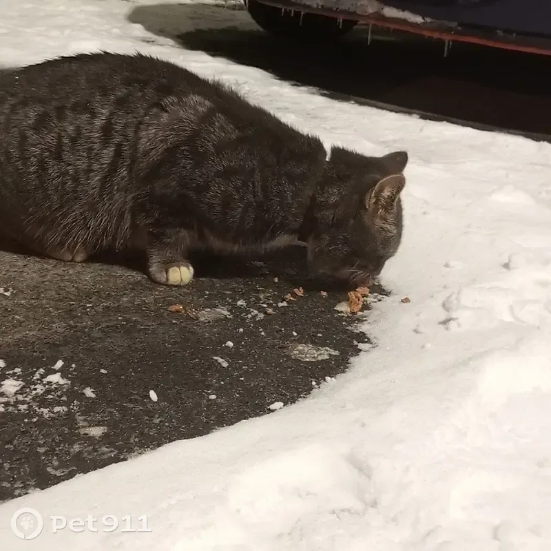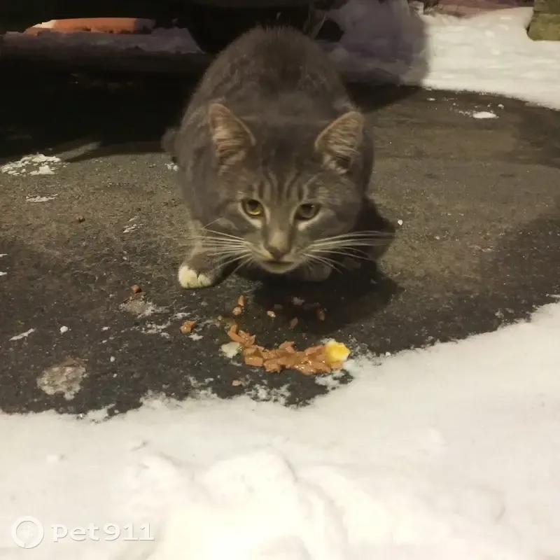 Серополосатый кот, взрослый. Забежал в подъезд, на шее ошейник, был сильно голодный. На улице минимум с 06.01.25. На 19.01.25 обитает в подвале дома, выходит к еде