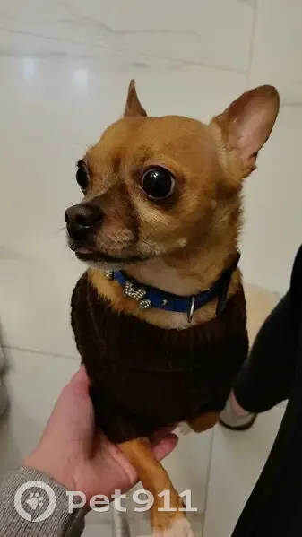 Кобель без клейма. Одет в вязаную коричневую кофточку, ошейник синий с пряжками, адресника нет. Возрастной.