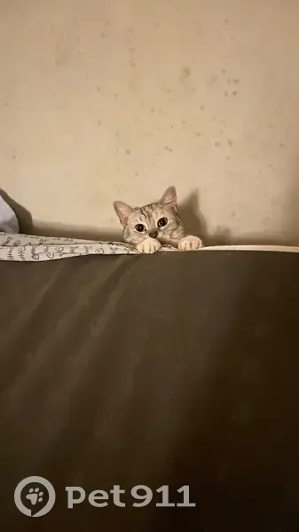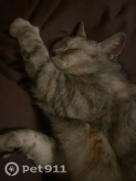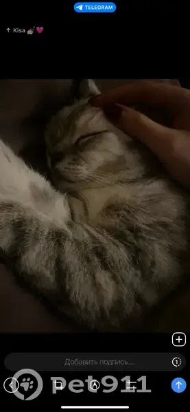 на ней ошейник от клещей вроде красный, пушистая, гладкая, ласковая, глаза мятные зелёные, красивая, ухоженная, хвост в полоску, как у лемура, сама она трехцветная (где-то рыжий, где-то серый и белый). В основном такая беленькая, мяукает очень тонким голосом