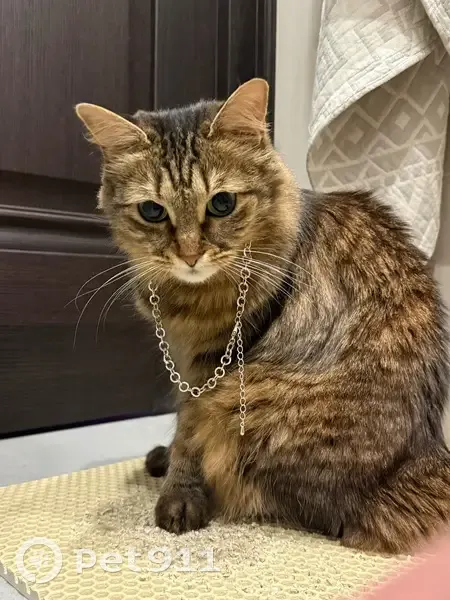 Темная, серая, коричневая( карамелька) пушистая, не маленького размера(в холке примерно 35-37 см… глаза зеленоваты-оливкого… пугливая, нежная, и очень любимая. Помогите вернуть мою Люлючку домой. Она выскочила из переноски
