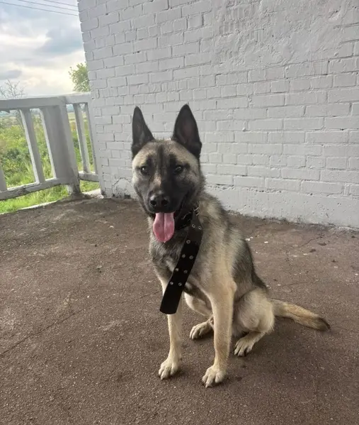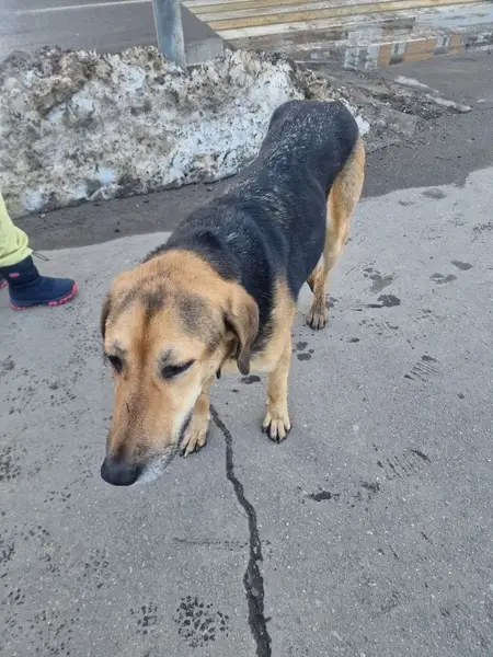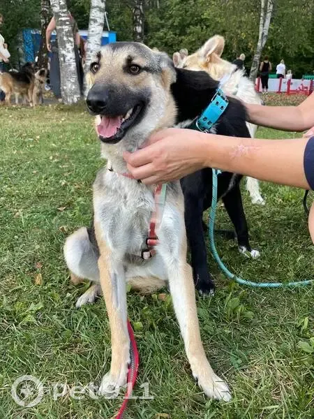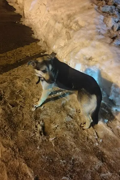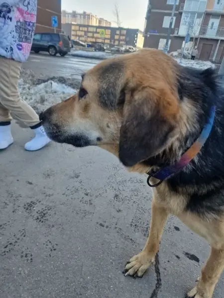 Ошейник с адресником на шее, собака небольшая, 12 кг, очень пугливая. 1 день в новой семье после нескольких лет в приюте.