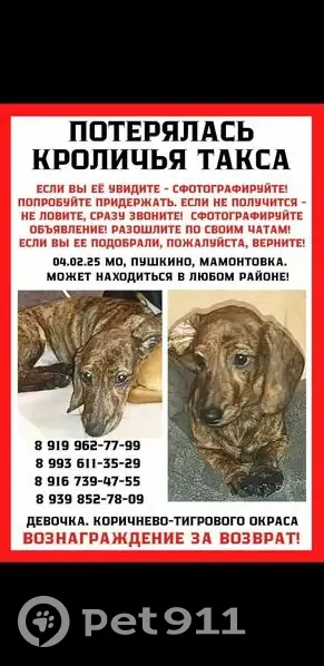 04.02.2025г потерялись две таксы,в районе церкви мкр Мамонтовка, г Пушкино. Мальчик чёрный с подпалинами и девочка коричнево тигровая.Мальчика нашли 14.02.2025г в мкр Звягино, г Пушкино. Поиск девочки продолжается. Важна любая информация. Если кто-то владеет хоть какой-то информацией дайте пожалуйста знать.
