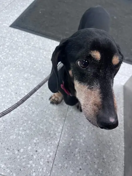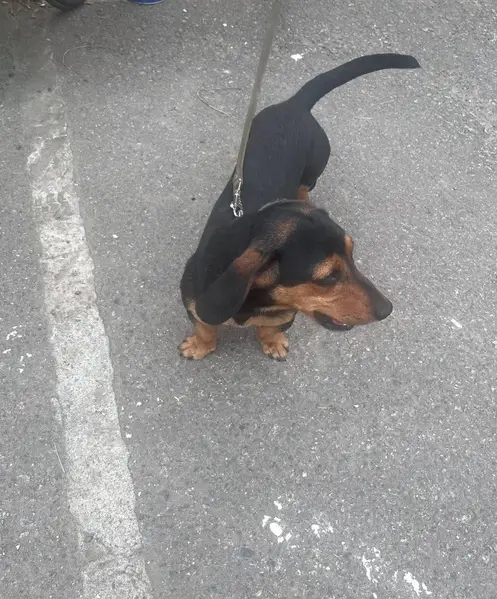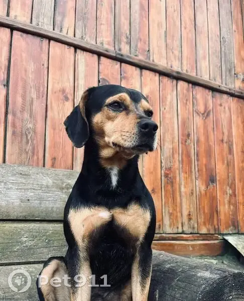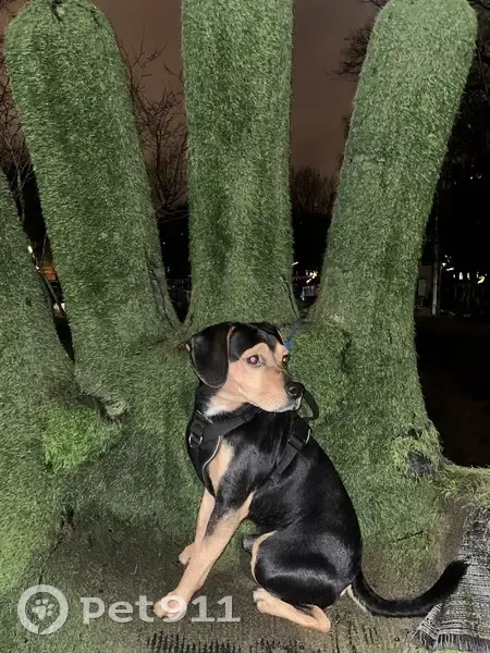 Помесь с биглем, убежал в медицинском воротнике, ошейник тонкий и темный, из носа торчит нитка(после операции), окрас как у добермана, не пугливый. Сделал под забором дырку и убежал с участка.