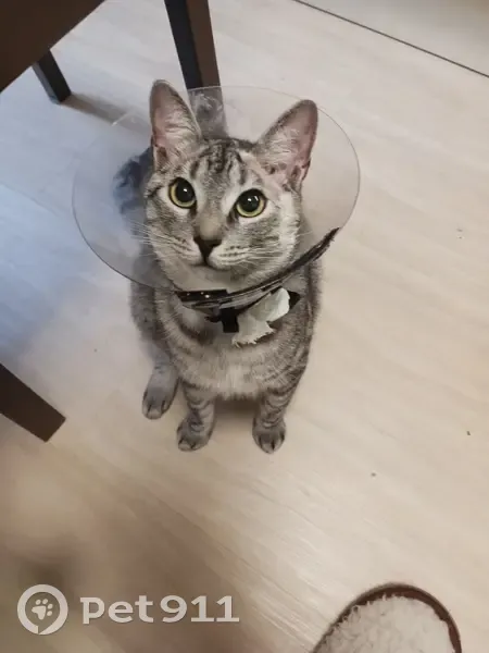 Серый, пятнисто-полосатый. В медицинском воротнике. Возможно, если не снял, в зелёной шлейке (велика по размеру) . На голове болячки (ТРЕБУЮТ ЛЕЧЕНИЯ). Хвост сломан. Пуглив, добрый