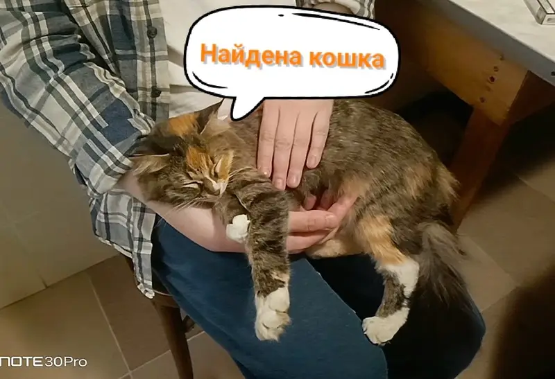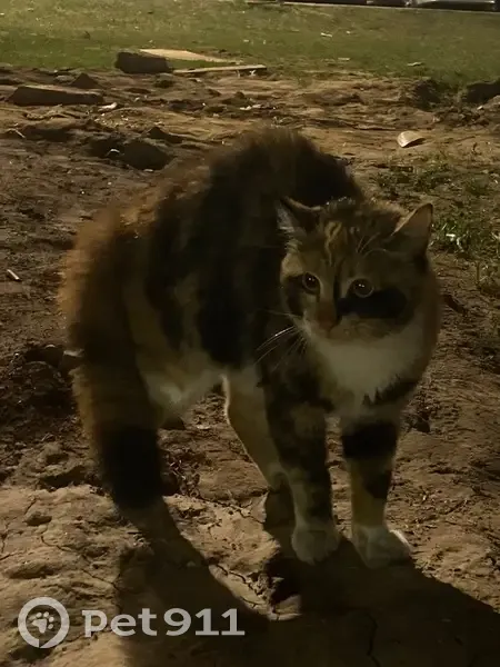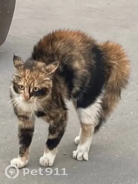 Найдена трехцветная кошка, домашняя НА УЛИЦЕ, убежала или подбросили к Макдональдсу, контактная, на фото шипит на собаку, при этом тут же гладится, бежит на кис-кис. Трехцветка, белые лапы и грудка, кисточки на ушах, слева на носу черная вертикальная линия, полоса, черное пятно под левым глазом, пятна под глазами.