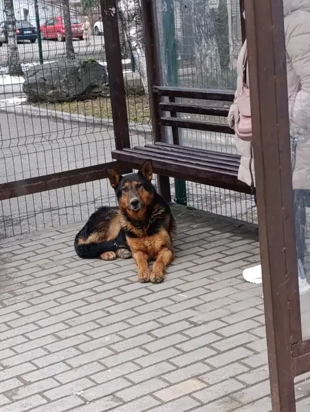 Чёрный с рыжим окрас, мальчик, похож на овчара на шее цепь из метала, сидит с утра в кустах