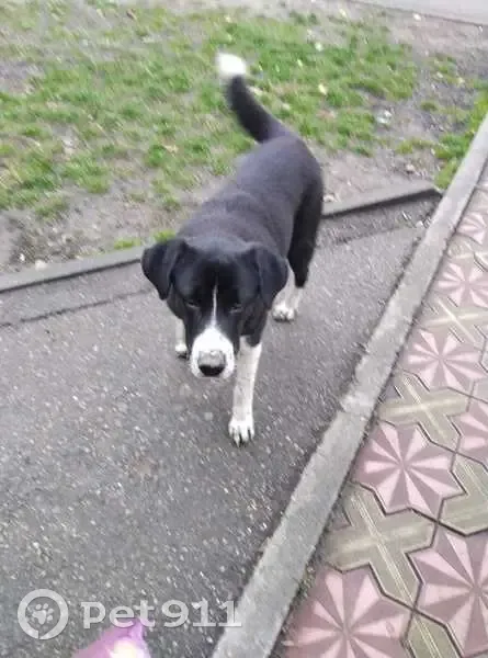 Порода смешанная ,скорее всего. Кобель. На вид месяцев пять. Контактный. Любит детей. Окрас чёрный с белым. Сидит около жилого дома. Подбегает к людям, хочет играть.