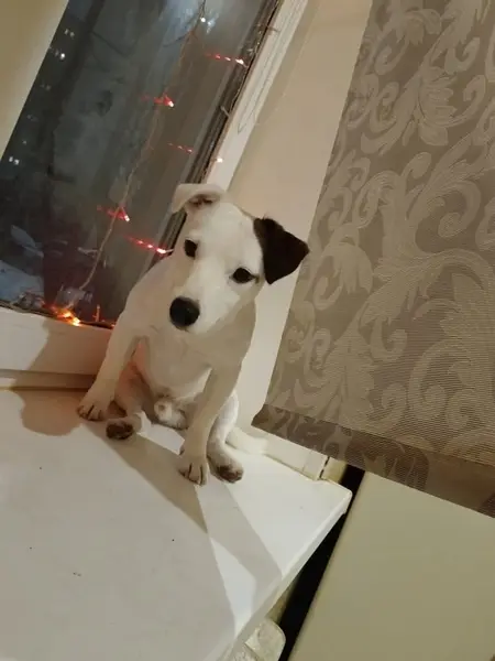 Породу не знаю , может дворняга , по виду месяцев 5, на шее оранжевый ошейник , белого цвета с черными пятнами ,