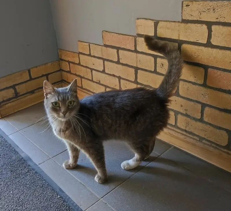 Возраст: 3 года. Стерилизованная. Беспородная. С зелёным ошейником от блох. Жёлтые глаза, шерсть серая, белая мордочка с носа, перетекающая на шею, также белые кончики лап.