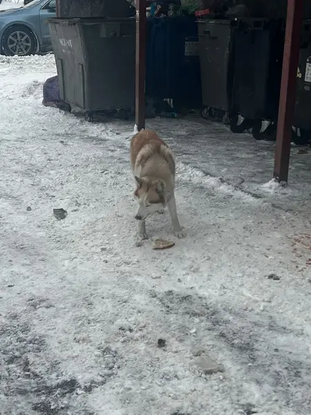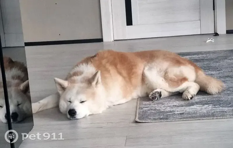 Порода Акито Ино,Бело-рыжий окрас,был в ошейнике разноцветном. На передней правой лапе,небольшая рамка.