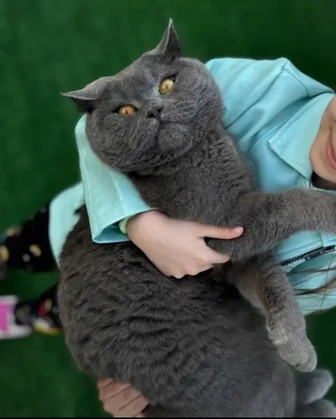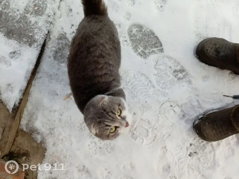 Вислоухая, пятнистая, белая грудка и лапки, серые полосатые пятна на всю спину и мордочку, зелено-желтые глаза, немножко сопит когда мяукает, прибилась к дому, живет в нашем дворе
