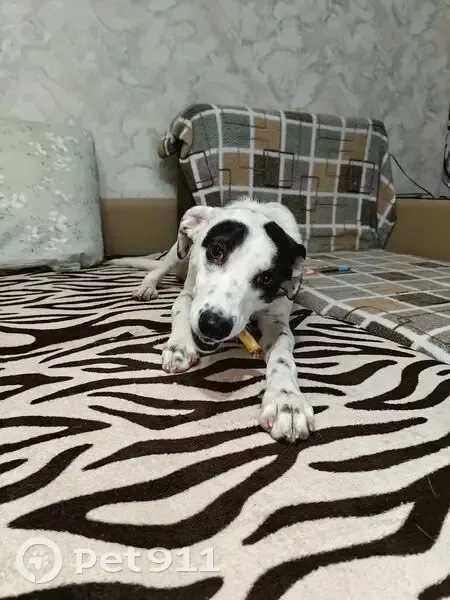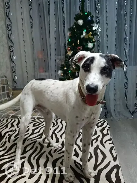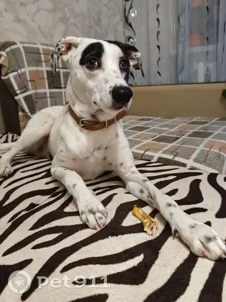 Белый окпас с пятнышками,чем то похож на долматинца. На задней лапке пальчик в бок торчит. Очень дружелюбный, знает команды.