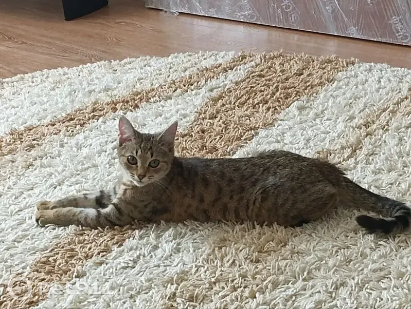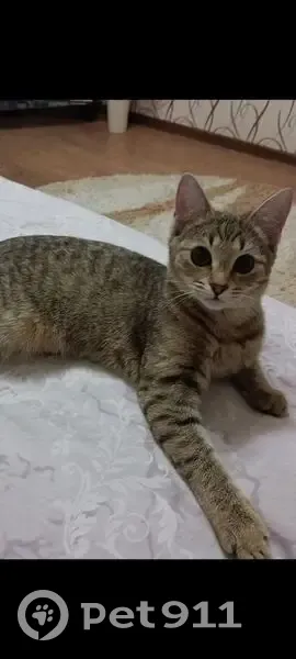 Серо-рыжая с чёрными пятнами/полосками, острые большие уши, пятно от зелёнки на животе, на спине возле хвоста коричневое пятно. Кошка домашняя, сбежала.