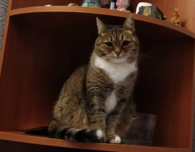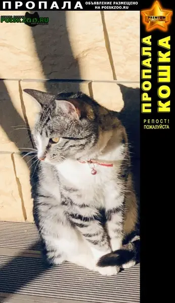 Трёхцветная кошечка, с серым ошейником, и приблизительно 2 года, сидела на крыльце, мяукала.