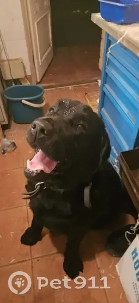 Чёрный большой пёс, короткошерстный. На шее чёрный ошейник. На лбу залысина - то ли шрам, то ли лишай. Судя по белым зубам, совсем молоденькие. Похож на лабрадора