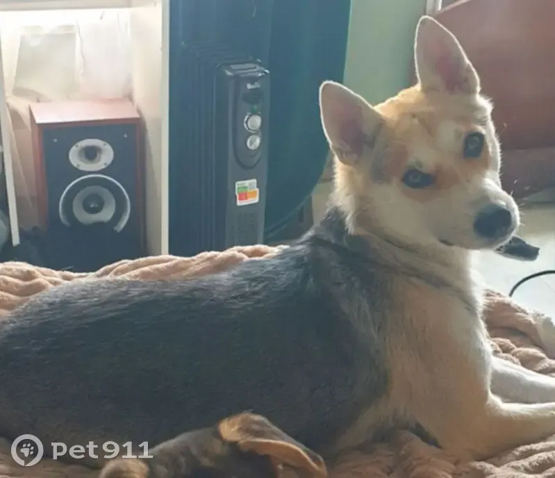 Белое брюшко и грудка, черная спина, светлые лапы, мордочка свеьлая и белая,остальное рыжеватое. Порода помесь Хас лайка. Вокруг глаз черная обводка. Сама больше на лайку похожа. Хвост не колечком(только полукольцо). Добрая, идет к людям и собакам всем.