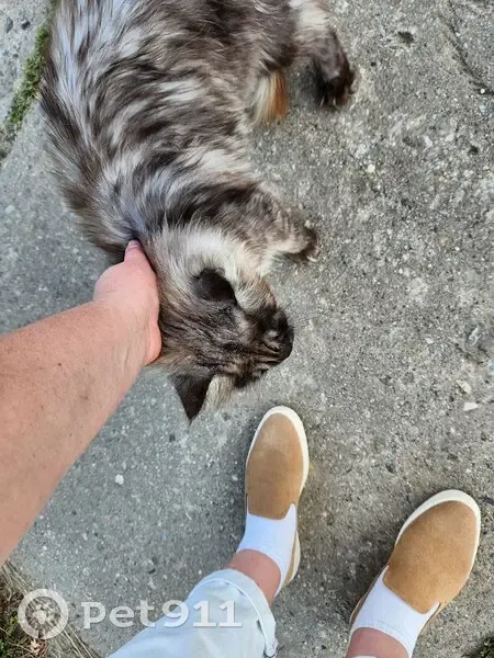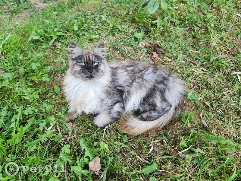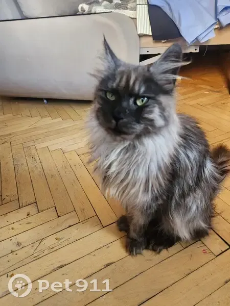 Кошка, порода Мейн-кун, примерно 4-5 лет, окрас черный дым, серая дымчатая, черная маска на мордочке. Истощена. В конце августа появилась в поселке, прибилась к стае бездомных местных котов. Ищу хозяина.