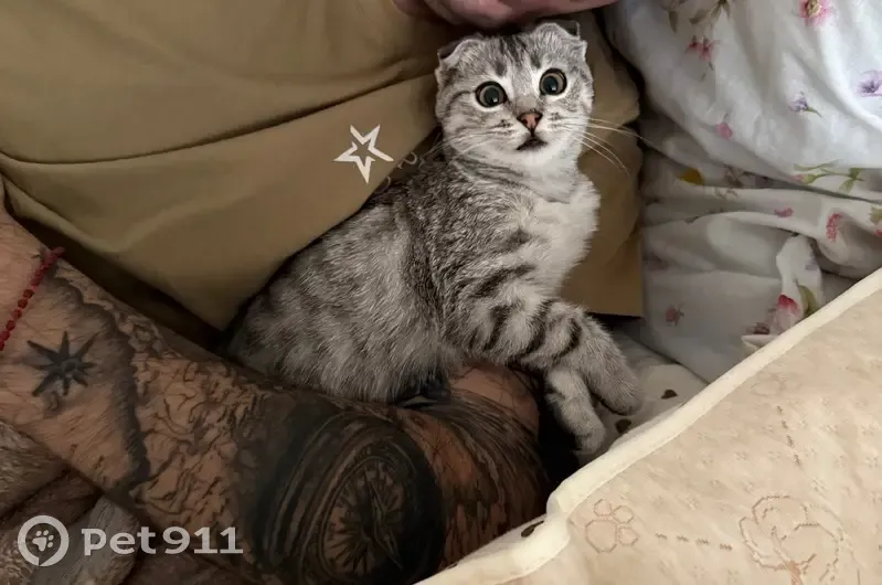 Вислоухая кошечка (возраст 4 месяца ) Серенькая и выделяемые полоски ,глаза карие Дверь открыли и выбежала за другой кошкой так и не вернулась