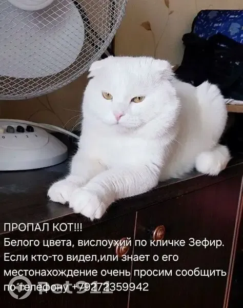 Пропал кот! Белого цвета, вислоухий ( ушки прижаты) глаза янтарного цвета, по кличке Зефир. В районе СНО южный Если кто-то видел,или знает о его местонахождение очень просим сообщить по телефону +79272359942